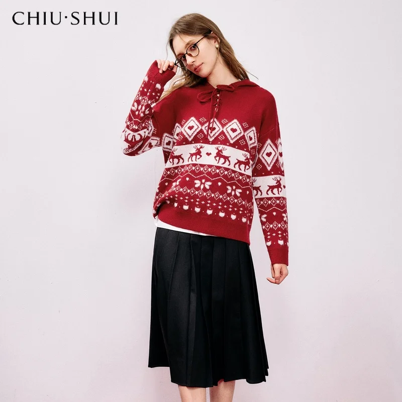 Free Sample Christmas New Women's Red Wool Knitwear Casual All-Match Hooded Pullover Sweater Style Front Logo